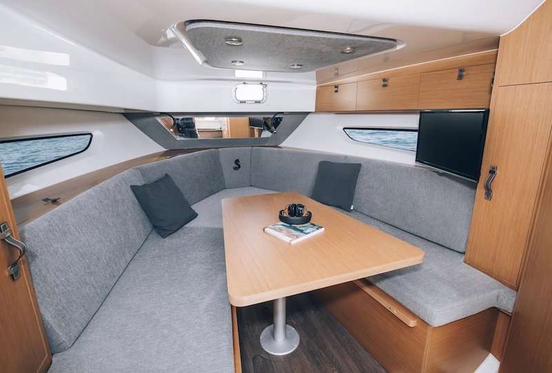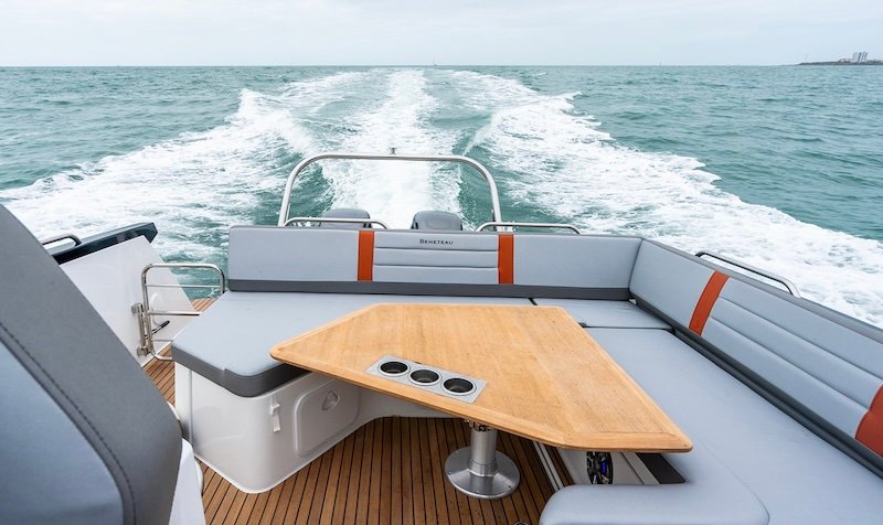 The cockpit has increased space and modularity, with foot-rest seats as well as an aft bench that folds back in seconds to form a large sunbathing area overlooking the swim platform.