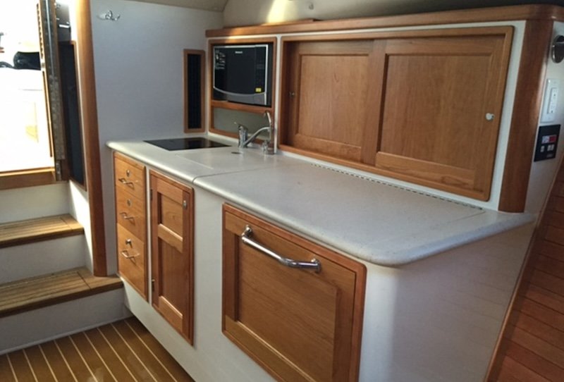 Nav Station to port with 25x17 surface for Chart kit and/or laptop and 4″ deep drawer.